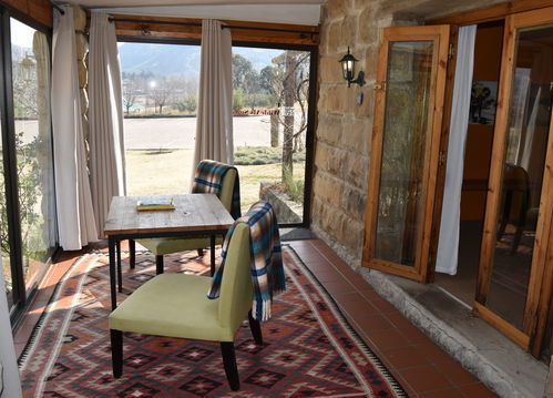 of kingsize or twin beds); full bathroom (with bath and shower); a separate toilet; kitchen/dining area and fully glazed private sunroom/patio with wood-burning stove. Electric blankets and wall heaters throughout (even in the bathroom) ensure that the suite is warm and cosy. The wood-burning stove on the verandah adds that extra touch of warmth in very cold weather. Framed by grapevines outside the bedroom window, the Wildeals suite has a view over the garden which, with the crisp night skies of Clarens, is perfect for planet spotting.